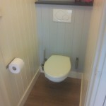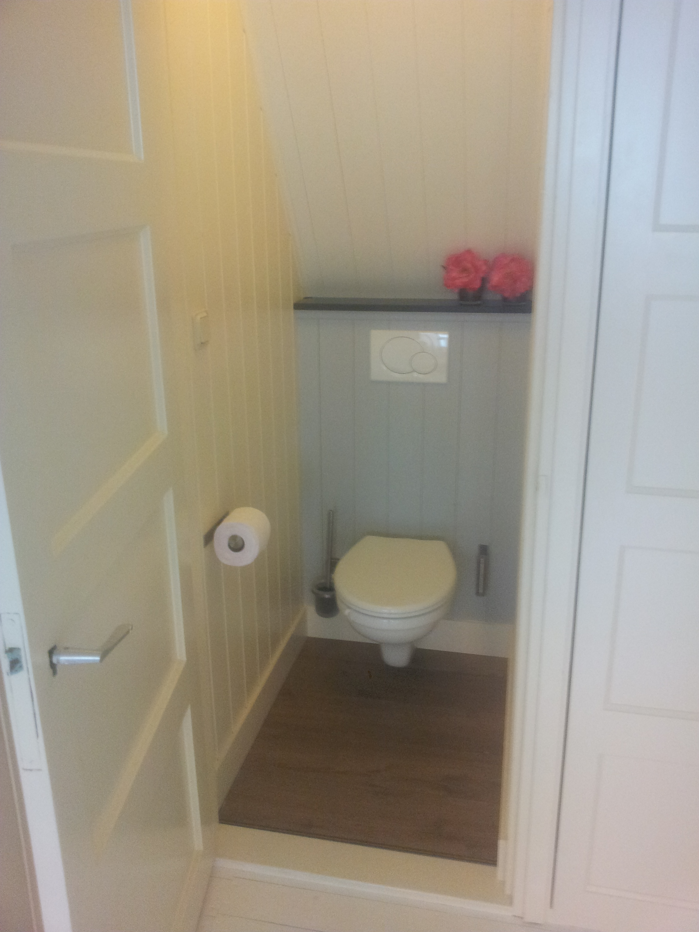 De inloopkast onder het schuine dak is omgetoverd tot een toiletruimte met een hangend toilet. Het betrof een een inloopkast op de eerste etage van een woning, zonder voorzieningen zoals bijvoorbeeld een afvoer. Door toepassing van een sanibroyeur is de aansluiting op het bestaande riool gerealiseerd.